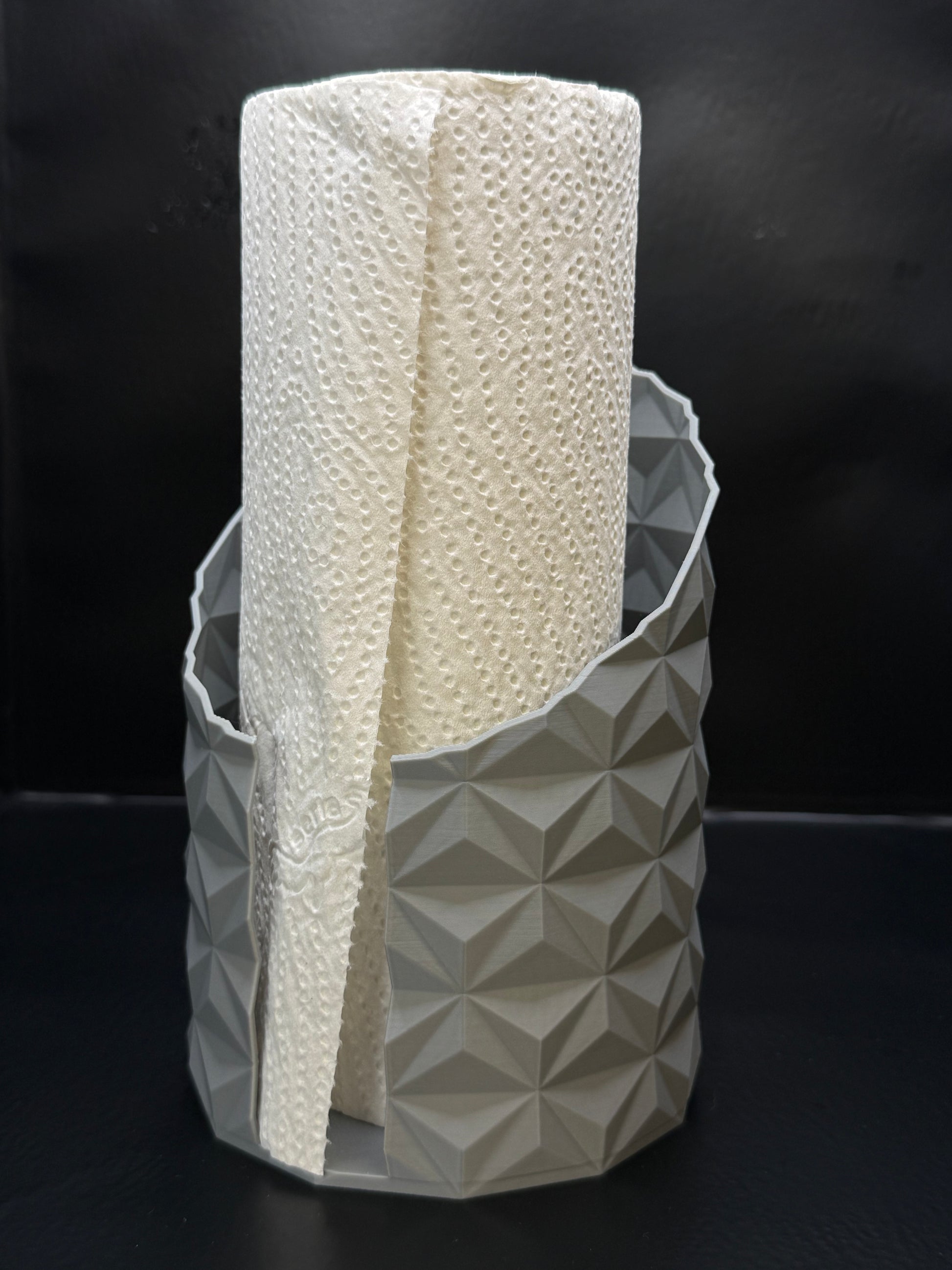 Denne papirholderen er alt annet enn kjedelig. Med sitt geometriske mønster og moderne design løfter den hele kjøkkenbenken — eller badet, om du vil.